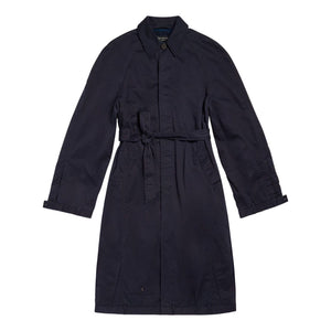 Blue night, cotton, Twill fabric, destructured design, classic collar, hidden front buttons closure, long sleeves raglan, edges with button, model with belt, two oblique side pockets, central rear slit and length under the knees. Deconstructed cotton coat Size and Fit - This piece fits true to size. We recommend you get your regular size. Model is 1,84m / 6ft 1in wearing size M