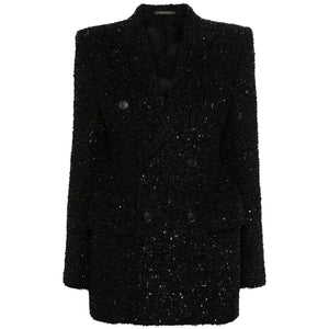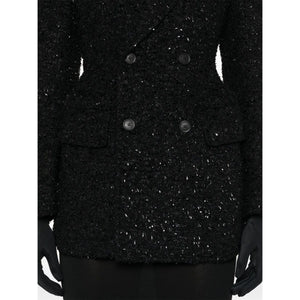 black wool blend tweed bouclé design peak lapels shoulder pads long sleeves with buttoned cuffs two front flap pockets two side inset pockets straight hem full lining double-breasted button fastening Wool blend coat Size and Fit - This piece fits true to size. We recommend you get your regular size. Model is 1,75m / 5ft 8in wearing size 36 (FR)