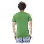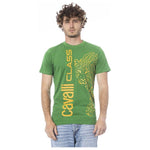 Elevate your wardrobe with the bold sophistication of a Cavalli Class Solid Color T-shirt. This emblem of trendsetting fashion is more than a basic; it’s a statement. Boasting the iconic Cavalli Class logo print on a lush green backdrop, this tee is tailored to cater to the discerning tastes of the contemporary man. Made from premium cotton, it promises comfort and durability, making it an essential for every fashion-forward closet.