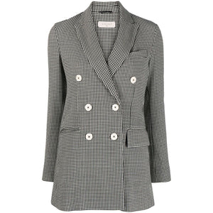 check-print double-breasted blazer from CIRCOLO 1901 featuring black/white, wool blend, check pattern, notched lapels, double-breasted button fastening, long sleeves, buttoned cuffs, chest welt pocket, side welt pocket, side flap pocket and central rear vent. Pied de poul double-breasted jacket Size and Fit - This piece fits true to size. We recommend you get your regular size. Model is 1,75m / 5ft 8in wearing size 40 (IT)