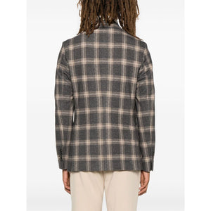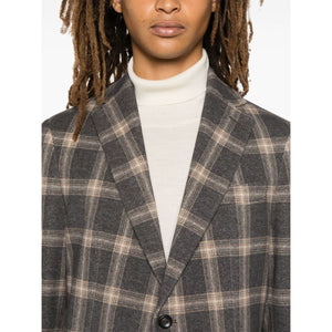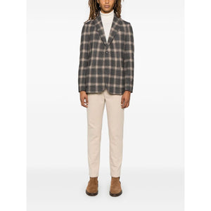 anthracite grey/barley brown cotton blend fleece texture plaid check pattern front button fastening notched lapels long sleeves faux-buttoned cuffs chest welt pocket dart detailing two front patch pockets English rear vents internal jetted pocket partial lining curved hem Cotton single-breasted jacket Size and Fit - This piece fits true to size. We recommend you get your regular size. Model is 1,84m / 6ft 1in wearing size 48 (IT)