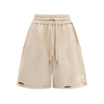 Comme Des Fuckdown cotton shorts with rips and frayed hem, drawstring waist and two side pockets