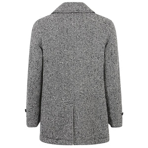 Black/white, V-neck with lapels, front button closure, long sleeves with buttons on the cuffs, back vent, straight hem. Wool double-breasted coat