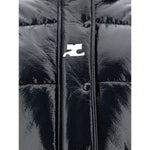 Crop Down Jacket by Courrèges, double-slider front zipper closure, high collar, all-over padded and quilted design, two zippered side welt pockets, elastic ribbed cuffs, regular fit, iconic contrasting brand logo on front.