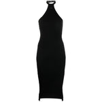 halterneck bodycon dress from COURRÈGES featuring black, ribbed knit, bodycon design, embroidered logo, halterneck, sleeveless, open back, below-knee length and ring hardware detailing. Sleeveless long dress Size and Fit - This piece fits true to size. We recommend you get your regular size. Model is 1,75m / 5ft 8in wearing size S