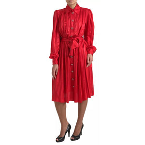 Dolce & Gabbana Red Button Down Belted Midi Satin Silk Dress