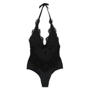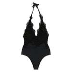 black halterneck tie fastening rear tie fastening V-neck Be mindful to try on swimwear over your own garments. Lace detail swimsuit Size and Fit - This piece fits true to size. We recommend you get your regular size. Model is 1,75m / 5ft 8in wearing size 1 (NUM)