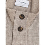 In beige linen, brown button closure, two front pockets with buttons, knitted turtleneck collar and elasticated waistband.