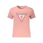 Dare to stand out with the Guess Jeans slim-fit tee, crafted for the fearless fashion enthusiast. This short-sleeved, crew-neck t-shirt boasts a bold print and iconic logo, ensuring your style speaks volumes. Made from a blend of organic cotton and a touch of spandex, it guarantees a perfect fit with eco-conscious comfort. Sourced with care from Bangladesh, this pink top is a must-have for trendsetters worldwide.