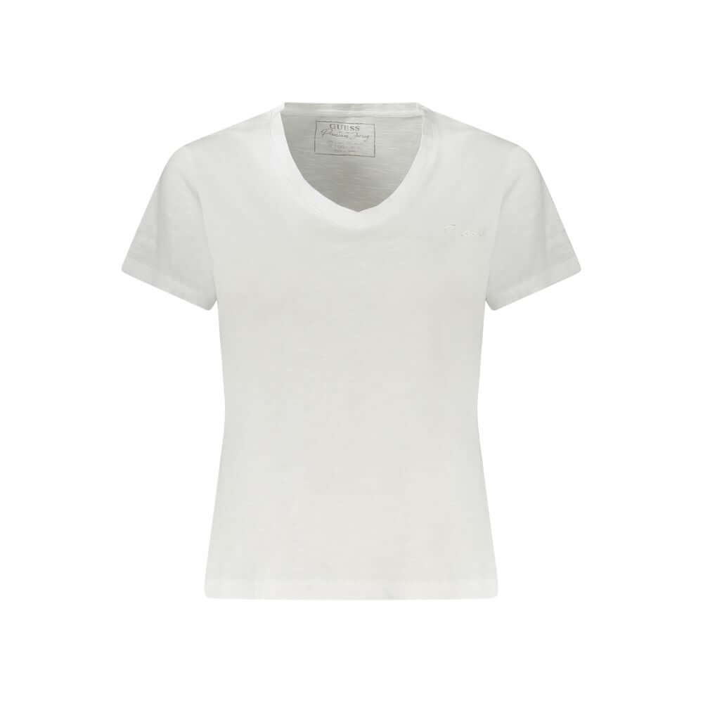 Dare to stand out with this chic ‘Guess Jeans’ V-neck tee, an embodiment of casual sophistication. The white short-sleeve shirt is accentuated with delicate embroidery, featuring the iconic Guess logo, offering a blend of comfort and glamour. Perfect for elevating your everyday style with a touch of luxury.