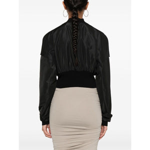black padded design ribbed band collar drop shoulder long sleeves sleeve zip pocket ribbed cuffs and hem cropped full lining concealed front zip fastening Cropped bomber jacket Size and Fit - This piece fits true to size. We recommend you get your regular size. Model is 1,75m / 5ft 8in wearing size 40 (IT)