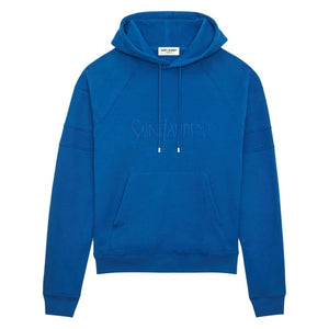 logo-embroidered cotton hoodie from SAINT LAURENT featuring cobalt blue, cotton, drawstring hood, long sleeves, straight hem, ribbed cuffs and hem and front pouch pocket. Logo cotton hoodie Size and Fit - This piece fits true to size. We recommend you get your regular size. Model is 1,84m / 6ft 1in wearing size M