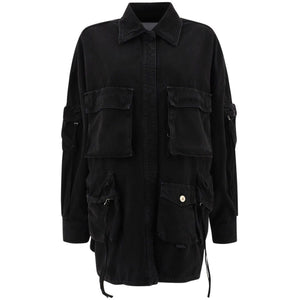 قميص أسود من القطن بياقة كلاسيكية وإغلاق أمامي مخفي وأكمام طويلة وأزرار وجيوب متعددة وحاشية منحنية المقاس والملاءمة - هذه القطعة تناسب المقاس الحقيقي. نوصيك بالحصول على مقاسك المعتاد. يبلغ طول العارضة 1.75 متر / 5 أقدام و8 بوصات وترتدي المقاس 40 (إيطاليا)