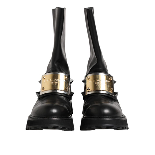 Dolce & Gabbana Black Leather DG Logo Plaque High Boots Shoes