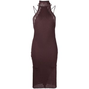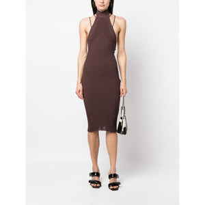 halterneck knitted midi dress from ANDREADAMO featuring brown, stretch-design, panelled design, ribbed knit, halterneck, rear tie fastening, rear criss-cross straps and knee-length. Ribbed midi dress Size and Fit - This piece fits true to size. We recommend you get your regular size. Model is 1,75m / 5ft 8in wearing size S