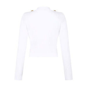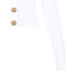 white ribbed knit V-neck long sleeves button fastening shoulder buttons V-necked cardigan Size and Fit - This piece fits true to size. We recommend you get your regular size. Model is 1,75m / 5ft 8in wearing size 36 (FR)