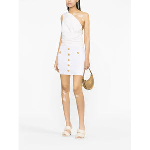 ribbed-knit mini skirt from Balmain featuring ribbed knit, high waist, gold-tone buttons, logo-embossed buttons, rear zip fastening, thigh-length, straight hem and white. High waist buttoned mini skirt Size and Fit - This piece fits true to size. We recommend you get your regular size. Model is 1,75m / 5ft 8in wearing size 36 (FR)