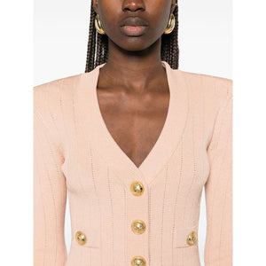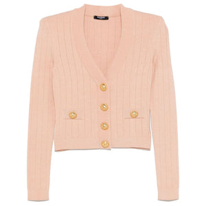 almond beige front press-stud fastening shoulder pads long sleeves faux pocket detail Buttoned v-necked cardigan Size and Fit - This piece fits true to size. We recommend you get your regular size. Model is 1,75m / 5ft 8in wearing size 36 (FR)