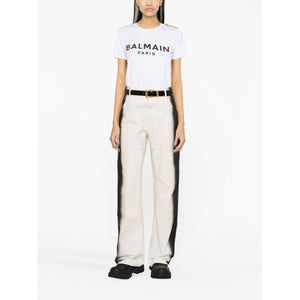 button-embellished logo-print T-shirt from Balmain featuring white/black, cotton, decorative button detailing, logo print to the front, crew neck, short sleeves and straight hem. Logo organic cotton t-shirt Size and Fit - This piece fits true to size. We recommend you get your regular size. Model is 1,75m / 5ft 8in wearing size S