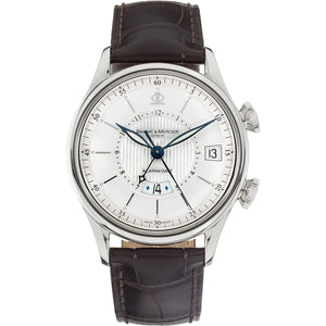 This water-resistant BAUME & MERCIER Classima wristwatch boasts a 39mm stainless steel case, a leather strap, and a sapphire dial. With its mechanic automatic movement and GMT date function, this Swiss-made watch is both practical and stylish for any gentleman.