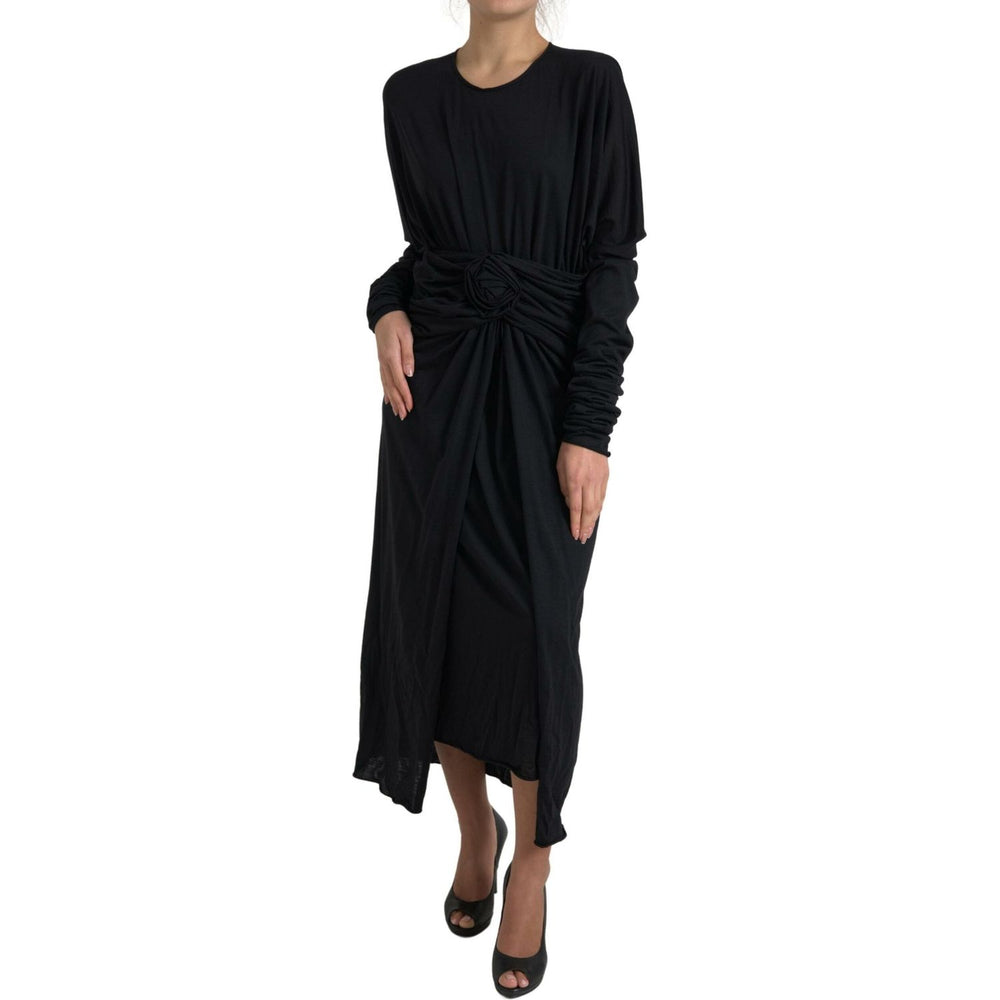 Dolce & Gabbana Black Wool Wrap Sheath Midi Gown Dress
