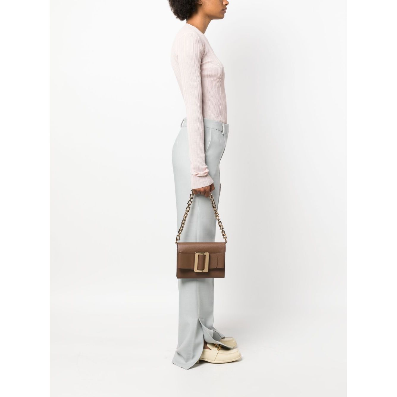 buckle-detail leather shoulder bag from BOYY featuring coffee brown, calf leather, grained texture, suede lining, accordion design, gold-tone hardware, decorative buckle detail, detachable chain-link shoulder strap, foldover top with magnetic fastening, partitioned compartment and internal zip-fastening pocket. Buckle Travel Case Epsom leather handbag Size and Fit - Width 8,27 in / 21 cm