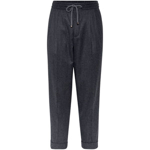 grey virgin wool pleat detailing elasticated drawstring waistband tapered leg two side inset pockets two rear welt pockets rolled cuffs Wool trousers