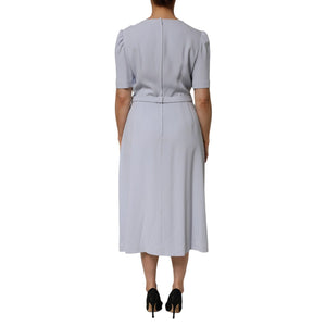 Gorgeous brand new with tags, 100% Authentic Dolce & Gabbana light blue midi dress. This elegant dress features short sleeves, a round neckline, and a statement floral applique at the waist. Designed in a soft viscose blend with silk lining for a refined finish. Perfect for formal occasions or special events.