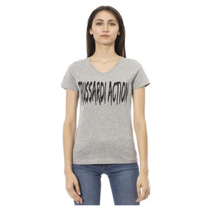 Add an air of effortless sophistication to your wardrobe with this Trussardi Action V-Neck Tee. A perfect blend of comfort and style, this chic short-sleeve t-shirt features an eye-catching front print that encapsulates the bold and trendy essence of the contemporary woman. Crafted from a luxuriously soft mix of cotton and viscose, it promises to elevate your casual look with a touch of Trussardi’s iconic Italian elegance. The subtle gray hue ensures versatility, making it a must-have in any fashion-forward ensemble.