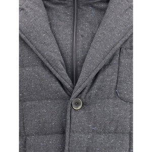 Herno’s Down Jacket with a design inspired by the classic blazer, made of wool with a mélange pattern. The model features classic lapels, front button closure and a removable zippered inner part that offers added protection and versatility. Applied welt pockets on the front, quilted design and warm but lightweight padding complete the garment. A perfect blend of sartorial elegance and outdoor functionality.