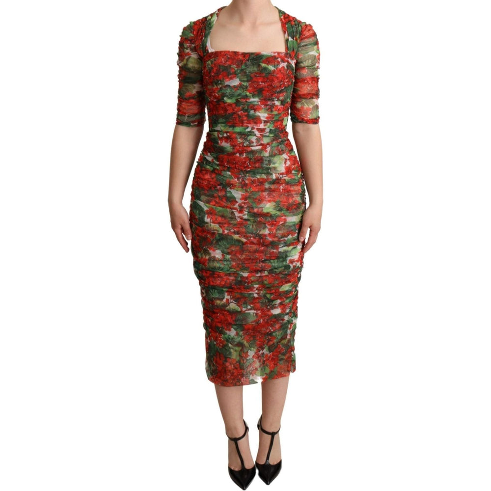 Dolce & Gabbana Red Floral Print Tulle Sheath Midi Dress