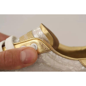 Gorgeous preowned with tags, 100% Authentic Dolce & Gabbana gold-tone and white Portofino sneakers are decorated with a mother-of-pearl print which makes them even more luxurious.